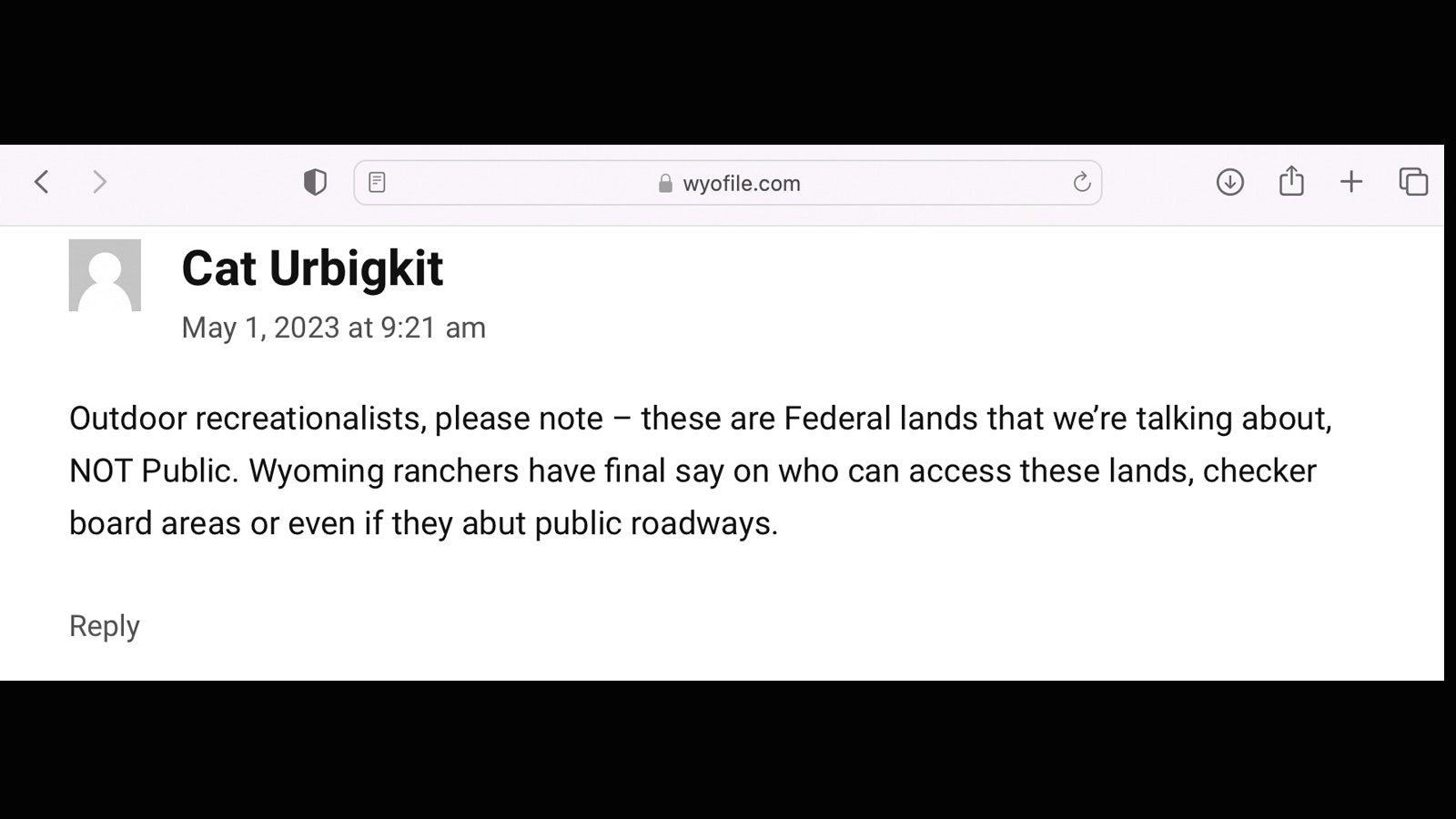 I checked my email Saturday afternoon and found a note asking, “Cat - surely you did not write this comment?” accompanied by a screenshot of an outrageous and factually incorrect comment posted to WyoFile in response to an Angus M. Thuermer Jr. article about the corner crossing case.