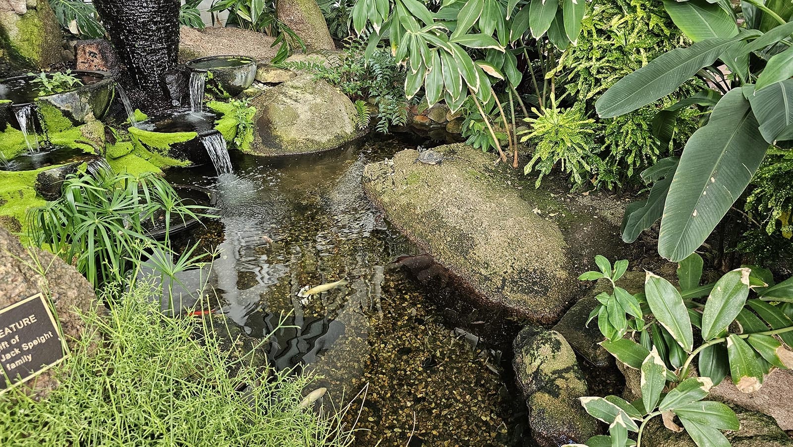 The koi fish below Yertle do a slow-motion ballet in the stream, celebrating music only they can hear. Water plops now and again in the distance as the fish dance in the bubbling, babbling stream of this tropical paradise, an emerald jewel in a most unlikely place.