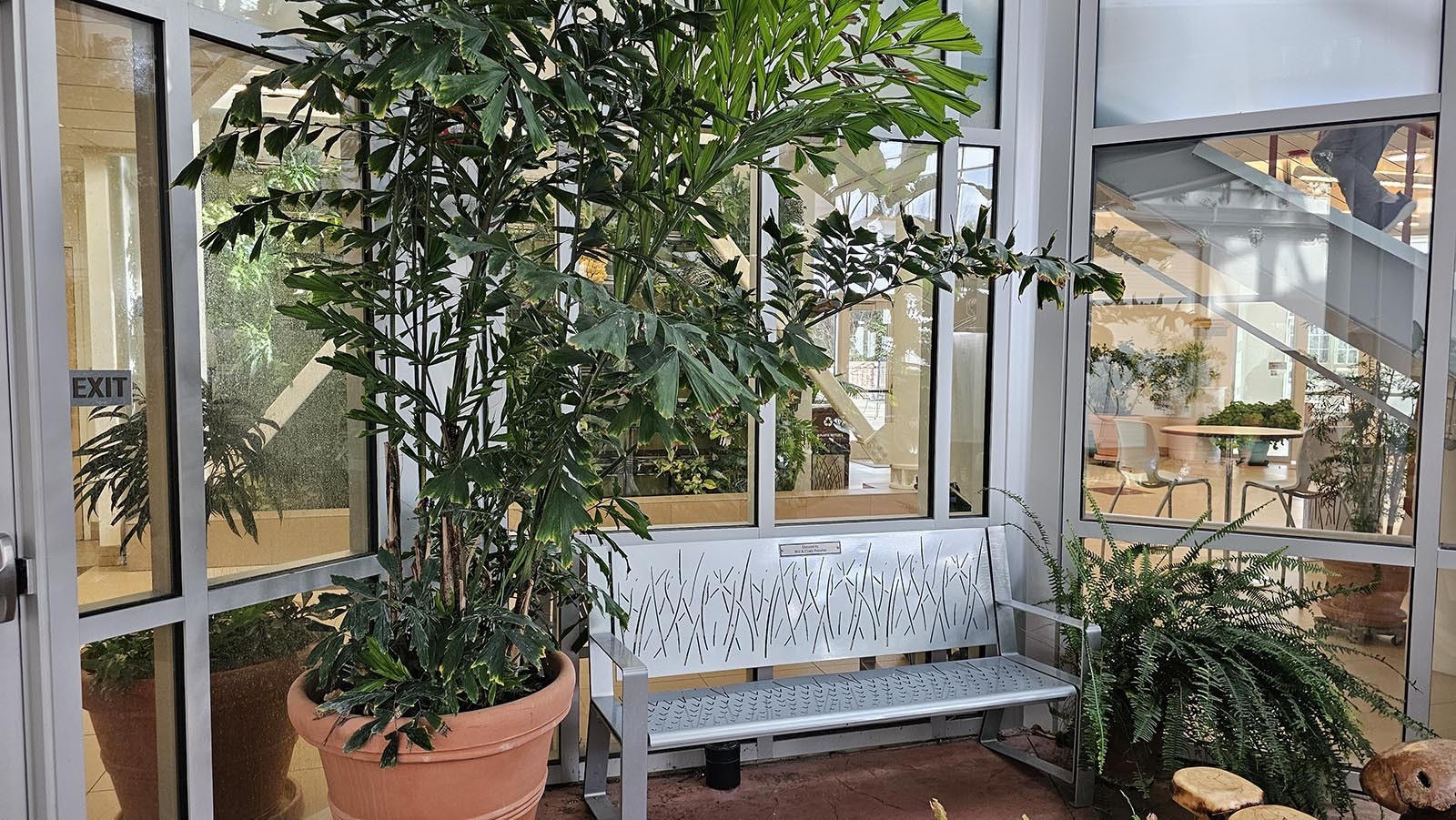 Because there’s a lot of shade in the conservatory, that tends toward understory and low-canopy types of plants. But there is one particularly big boy, towering three stories over everything, the tips of its spiky leaves nearly brushing the ceiling.