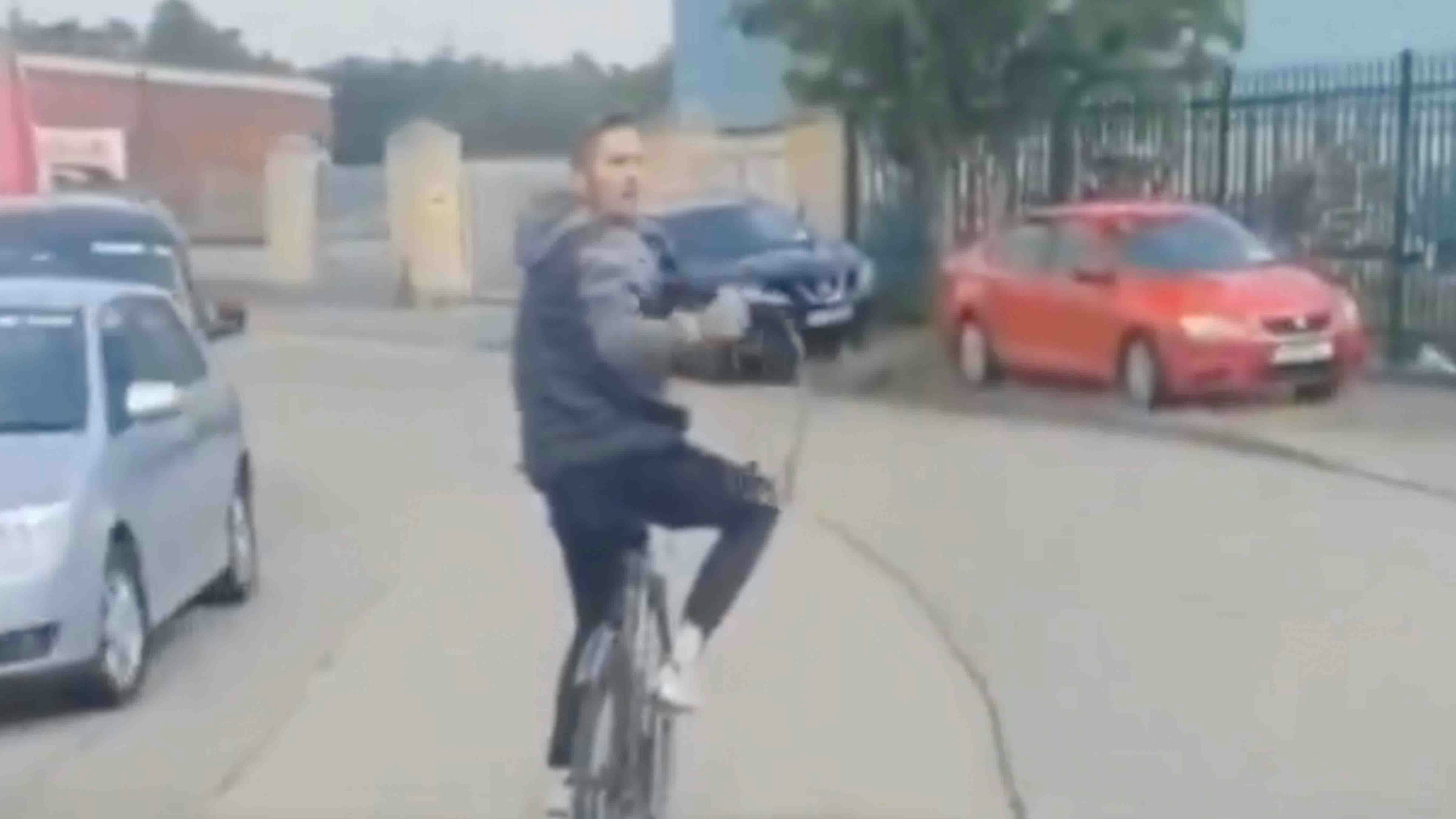 Cyclist gets what he deserves, as narrated by MMA announcer Steve Inman....